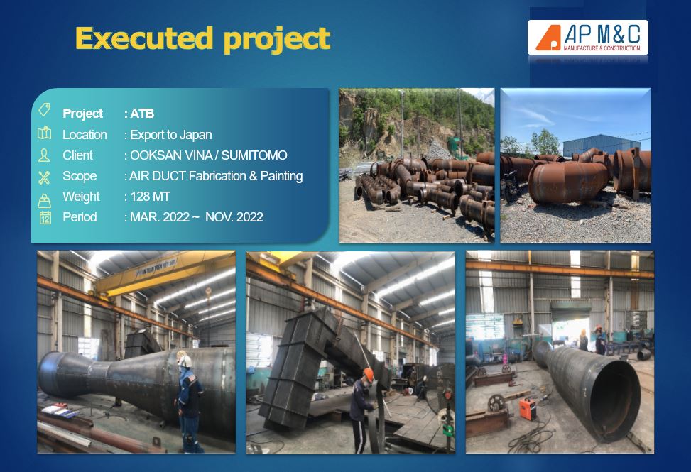 Project : ATB Location : Export to Japan Client : OOKSAN VINA / SUMITOMO Scope : AIR DUCT Fabrication & Painting Weight : 128 MT Period : MAR. 2022 ~ NOV. 2022