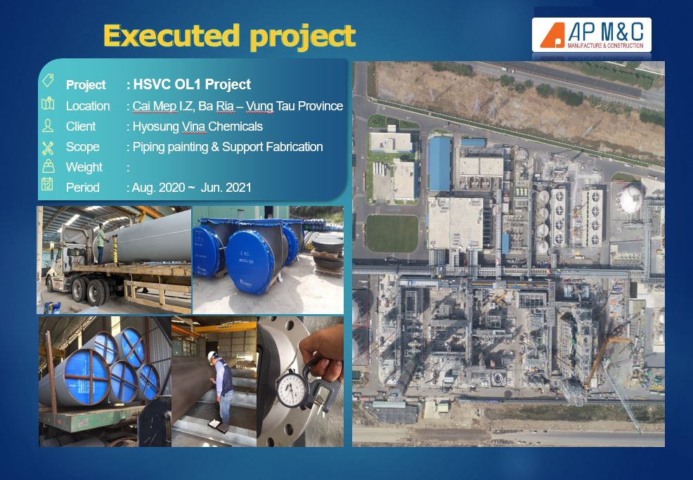 Project : HSVC OL1 Project Location : Cai Mep I.Z, Ba Ria – Vung Tau Province Client : Hyosung Vina Chemicals Scope : Piping painting & Support Fabrication Weight : Period : Aug. 2020 ~ Jun. 2021